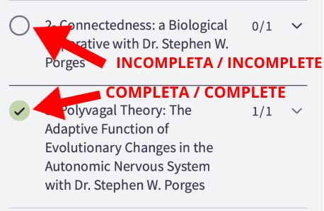 Si alguna de sus sesiones no está marcada como «completa» simplemente puede ir a la sesión en cuestión y hacer click en el botón «completar y continuar» que verá en la parte inferior de su pantalla.